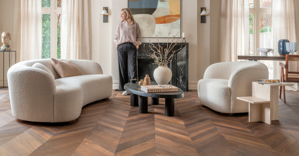 Residence (shown here) is a collection of 10 elegant and refined floors that embody contemporary luxury, suited to chic, modern interiors. There are three designs to choose from, plank, herringbone and chevron which work as a multi format system with interchangeable colours and designs to create sophisticated laying patterns.