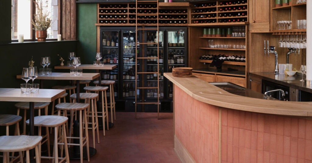 The cabinetry, tables, and bar tops feature rich, honeyed hardwood tones, contributing to the overall ambiance of the restaurant.